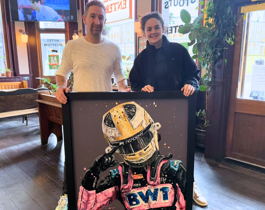 Paul’s celebration of motorsport extends beyond Formula 1’s established champions. In 2019, a sixteen-year-old Abbi Pulling messaged Oz on Instagram to share her GCSE art coursework; she had chosen him as her subject and recreated his style for the project. Five years later in Miami, she reintroduced herself, in full Alpine team kit, as an F1 Academy driver. Pulling had just taken pole position, and would go on to win both races that weekend, and dominate the 2024 season. Before the Autosport Awards where Pulling would receive her championship trophy, her manager contacted Oz to arrange a surprise. They orchestrated a surprise meeting for Oz to present Pulling with a portrait featuring her signature winning celebration pose, completing a circle that began with a student studying an artist’s work and ended with the artist documenting hers.