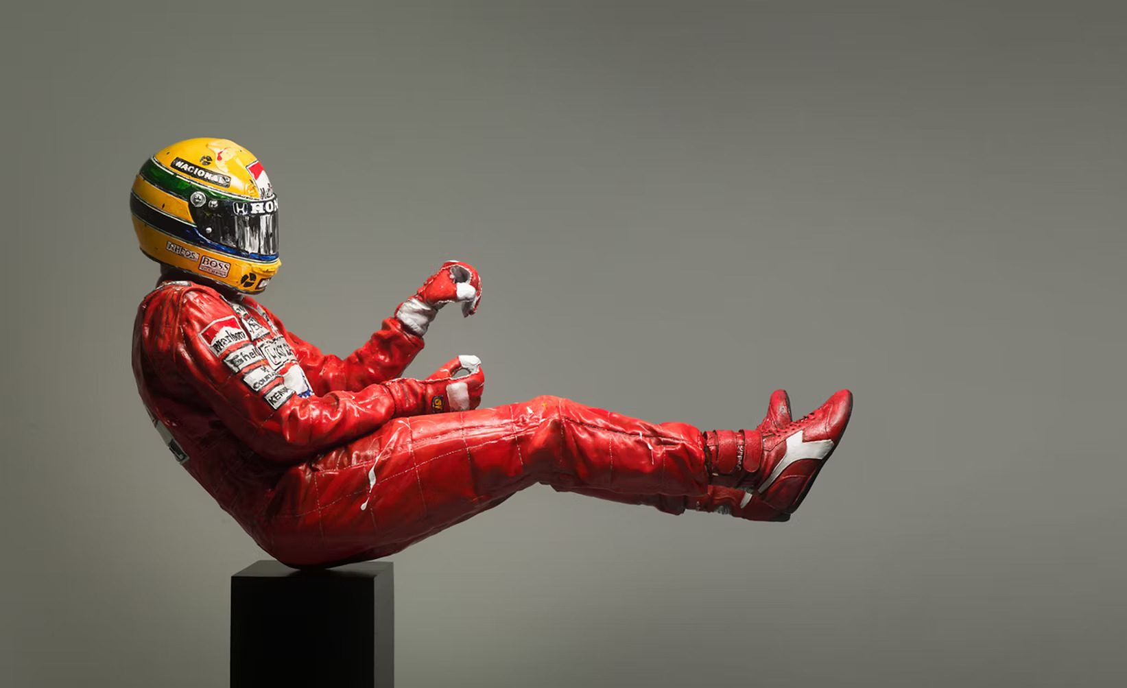 Oz’s sculptures take his dimensional work further, combining traditional lost wax casting with 3D scanning technology, merging centuries-old bronze techniques with contemporary precision. McLaren approached him about creating a series of bronze monuments for a world champions series to adorn the halls of MTC, marking 50 years since Bruce McLaren’ passing and the successes he put into motion. The commission gave him permission to work at scale, producing life-size statues that would be installed permanently at the Centre. He completed Bruce first, then Niki Lauda, James Hunt, and Ayrton Senna. For the original Senna bronze, Oz wore a replica suit and held the driving position through dozens of three-minute scanning sessions while cameras captured every angle. The digital model moved through clay for detail work, then wax, then bronze, preserving the exact posture, helmet angle, and hand placement that defined how Senna drove.