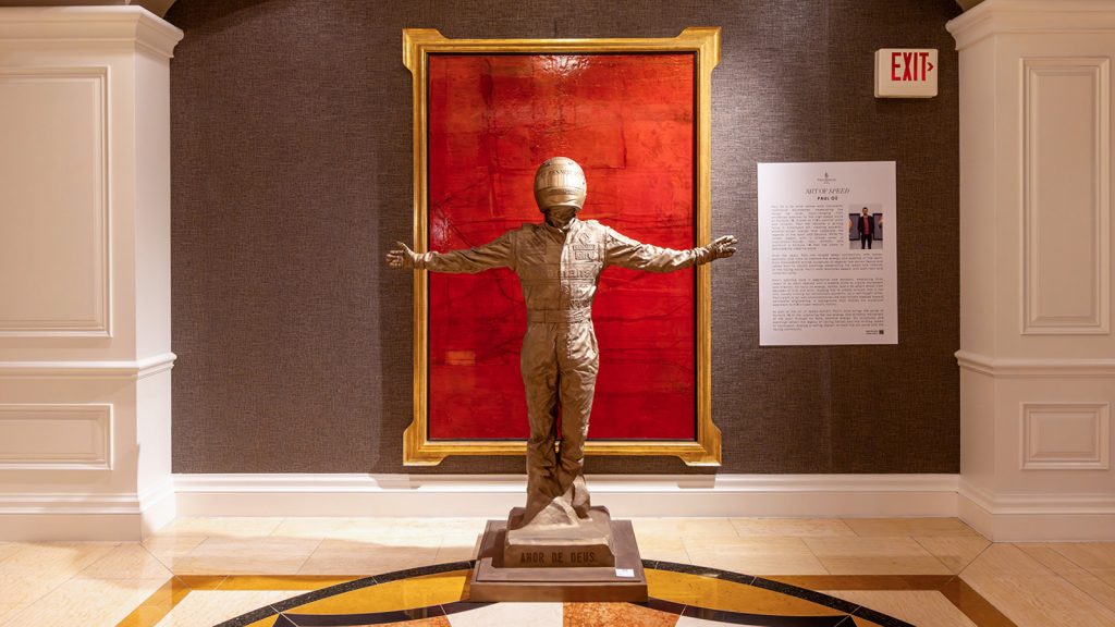 The Formula 1 Las Vegas Grand Prix threads a 6.2-kilometer circuit through the city’s most recognizable landmarks. Pop ups, fan experiences, and brand experiences can be found at every turn. At the Four Seasons Hotel, you’ll find the Art of Speed exhibit, presented in partnership with the Hall of Fame Collection, which brings British artist Paul Oz back as Artist in Residence for the third consecutive year. His motorsport portraits and bronze sculptures transform the hotel’s corridors and public spaces into a gallery-style homage to the greats of F1.