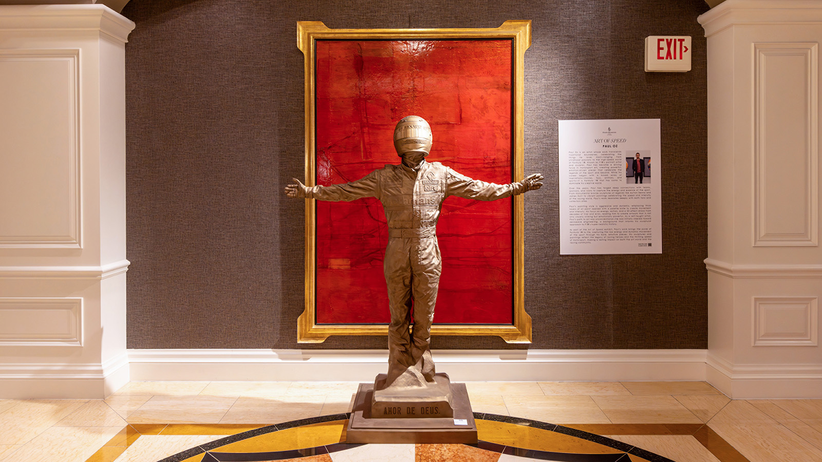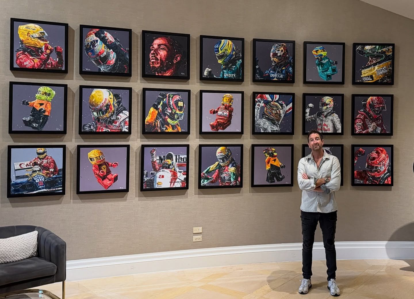 This year’s Art of Speed features paintings and sculptures from Oz’s Formula 1 Collection, anchored by The Champions Wall: 20 portraits spanning the history of world champions. Each portrait documents a driver, a moment, or a career-defining achievement; forming a visual history of who shaped the sport across decades. The work appears in the Moët-Hennessy Champions Lounge alongside the Hall of Fame Collection’s authentic race-worn suits and helmets, creating a mixed-media presentation of Formula One history.