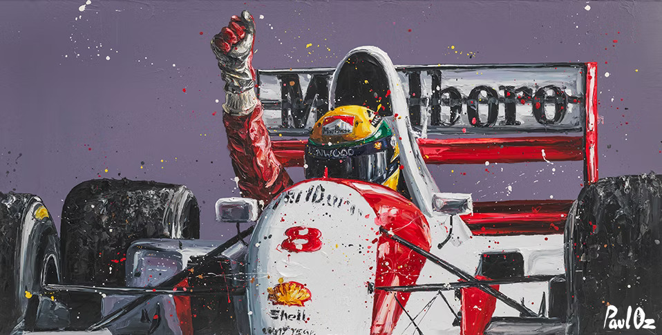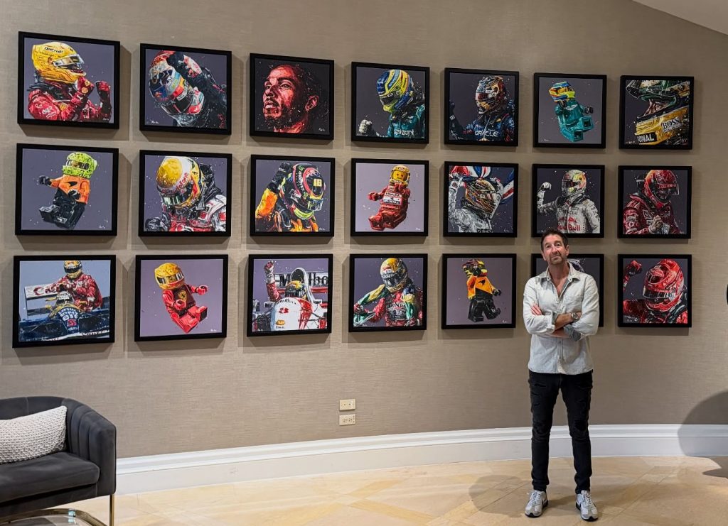 His breakthrough arrived in 2009 at an official Formula 1 party in London where his portrait of McLaren driver Ayrton Senna, The Rainmeister, received attention. McLaren purchased the piece for their Technology Centre in Woking. That single sale introduced him to team principals, sponsors, and drivers who had a passion for what he was trying to capture. The next decade unfolded across the Formula 1 calendar. Oz worked with McLaren, Mercedes AMG Petronas, and Scuderia Ferrari, painting live at circuits from Monaco to Singapore. He created portraits for Lewis Hamilton, Max Verstappen, Jenson Button, and Jackie Stewart. Teams brought him into sponsor activations and VIP events, placing him where he could work in real time while fans watched the process. The role became official without ever being formally defined; he was Formula 1’s portrait artist.